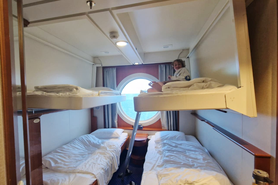 Wij hebben gekozen voor een ‘buitenhut, een ‘standaard hut met zeezicht. Deze hebben een groot raam waarmee je naar buiten kunt kijken. Ze kosten iets meer, maar ik vind dat dit de ervaring wel compleet maakt. Er zijn overigens ook standaardhutten aan de binnenkant van het schip. Daar heb je dus geen raam, voor de rest, zijn ze hetzelfde.