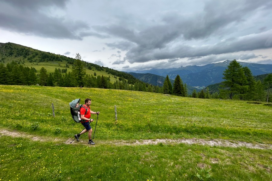 Martijn wandelde met de kinderdrager in de bergen omdat ik zwanger ben. Maar mocht je de kinderdrager willen afwissen, dan is dit vrij eenvoudig te doen.