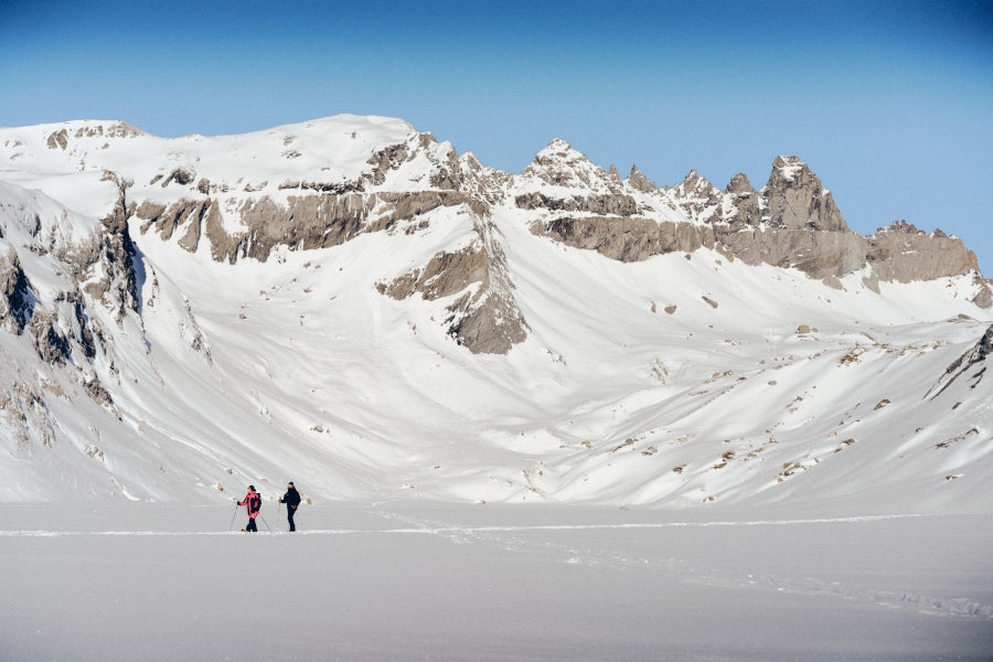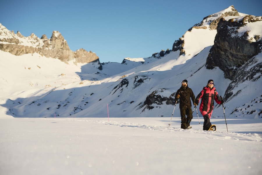 Tijdens een sneeuwschoenwandeling onder begeleiding van een GeoGuide ontdek je de iconische Sardona-landschappen. Dankzij de nieuwe FlemX gondel sta je binnen een paar minuten midden in het verlaten berglandschap. Met krakende sneeuw onder je sneeuwschoenen kijk je uit op de gekartelde Tschingelhörner-bergkam. Hier ervaar je de stilte van de hooggelegen Segnesboden-dalen en vergaap je aan omliggende witte bergreuzen. De tocht volgt een goed gemarkeerde en veilige route, waardoor hij ook toegankelijk is voor wie nog niet zoveel ervaring met sneeuwschoenwandelen heeft. De gids kent dit gebied op zijn duimpje en neemt je mee op tijdreis door de vorming van de Alpen. Het hele avontuur duurt zo’n drie uur.